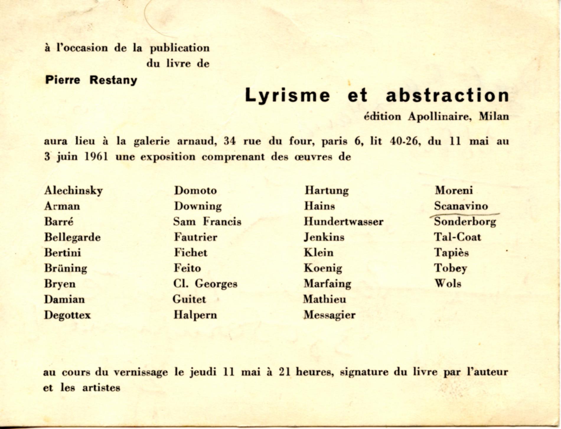 Prende parte alle tappe italiane della manifestazione, alla Galleria Il Canale di Venezia, in concomitanza con l’apertura della XXX Biennale, e alla Galleria Brera di Milano nel giugno del 1961. Oltre a lui gli artisti partecipanti sono Baj, Bat Josef, Bona, Bouvier, Brauner, Cazac, Corso, Crippa, Paolucci, Dado, Dorcely, Dova, Ferro, Guino, Harloff, Herold, Hiquily, Hundertwasser, Lam, Lebel, Le Toumellin, Licata, Lora, Manina, H. e P. Martin, Matta, Metcalf, Michaux, Mondino, Oppenheim, Penalba, Peverelli, André - Poujet, Quentin, Saby, Tancredi, Tinguely, Visieux, Zanartu.