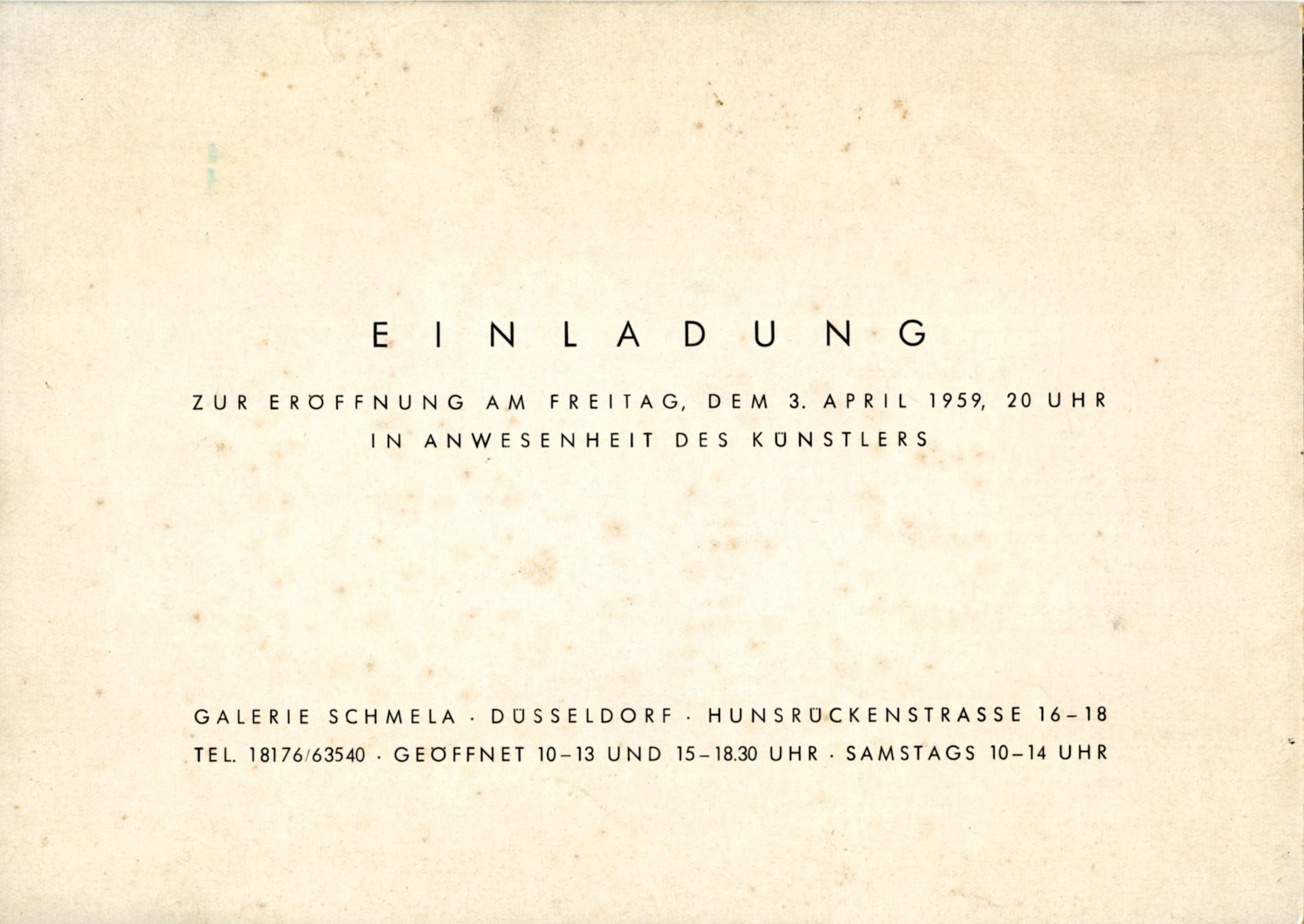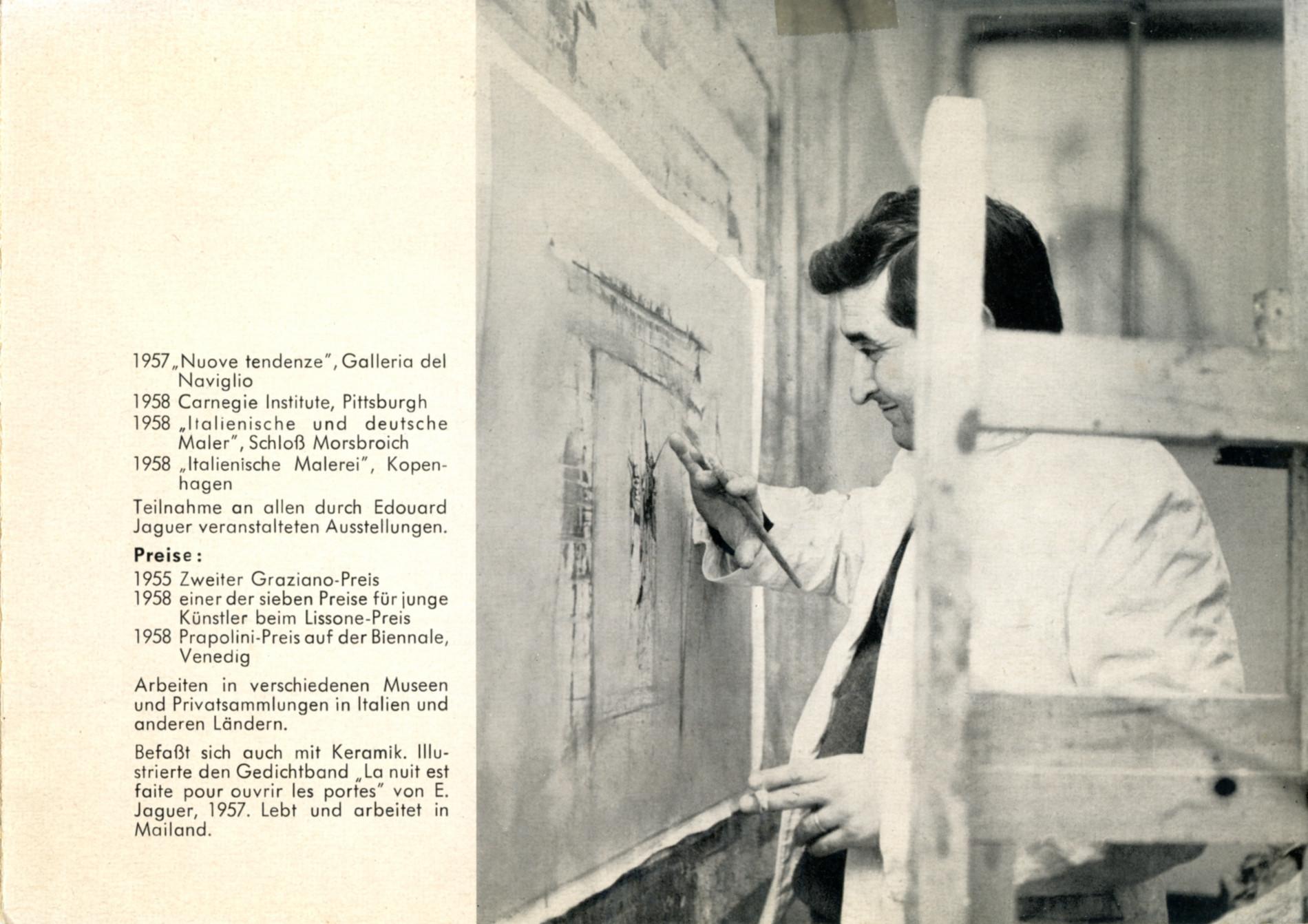 Nel 1959 tiene diverse mostre personali alla Galleria del Naviglio a Milano, alla Galerie Schmela a Düsseldorf e alla Galleria del Cavallino di Venezia con catalogo e testo di Umbro Apollonio.