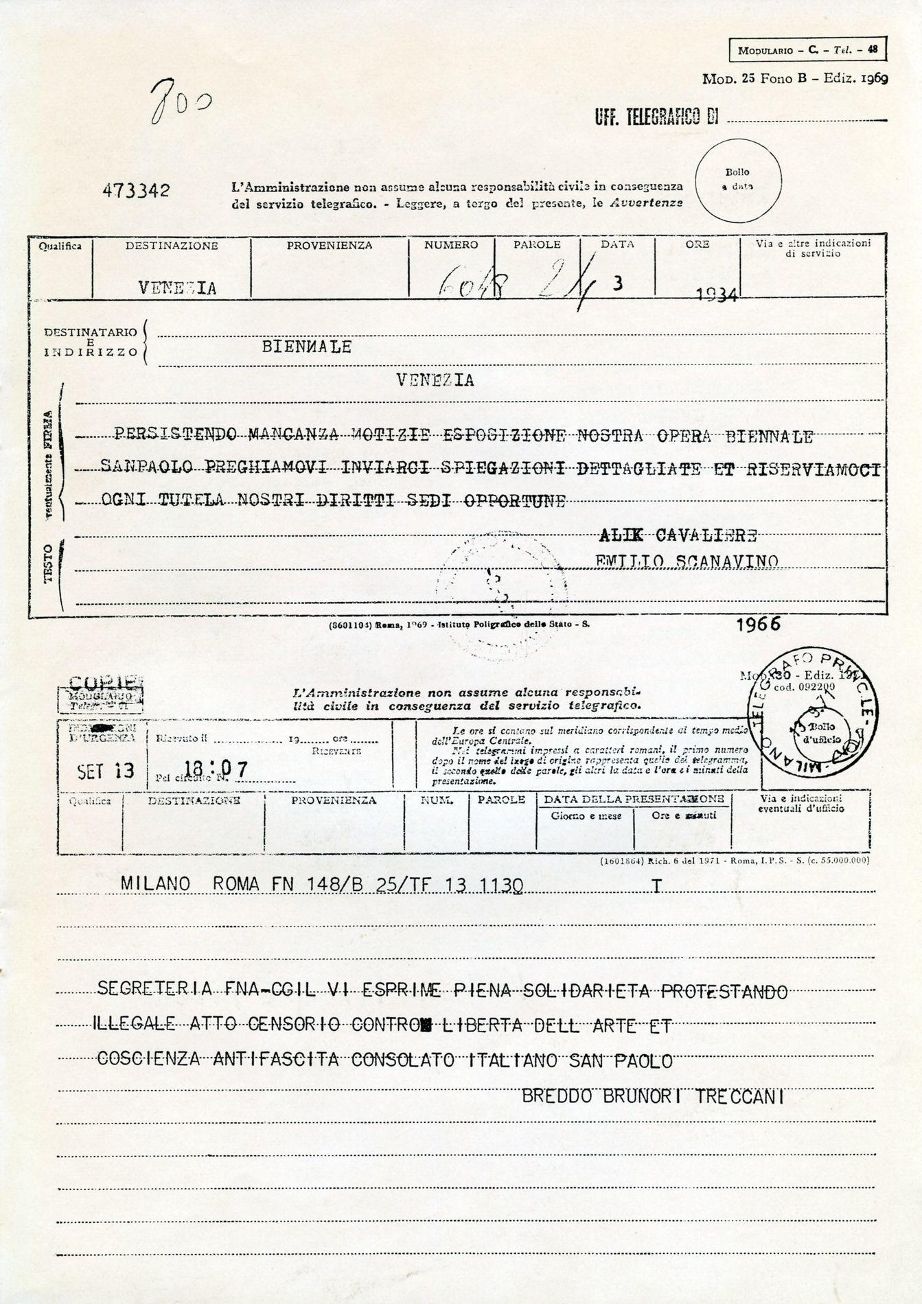 Sempre nel 1966 espone alla Galleria De’ Foscherari, a Bologna con catalogo e testo di Pietro Bonfiglioli, alla Galleria Ferrari di Verona, e nel contesto di altre importanti collettive: Aspetti dell’arte italiana contemporanea, presso la Galleria Nazionale d’Arte Moderna, a Roma; Tokyo International Exhibition of Art, in Giappone; Graphics ’67, presso la Lexington University of Kentucky Art, in Inghilterra.